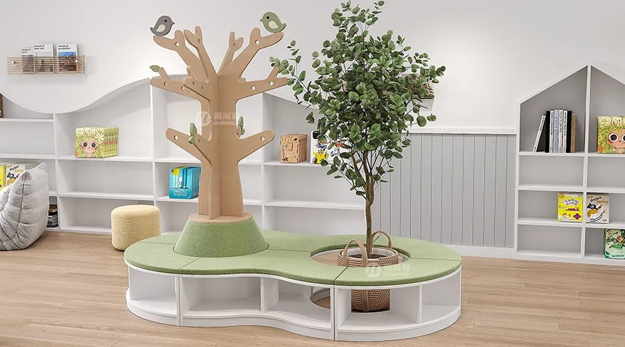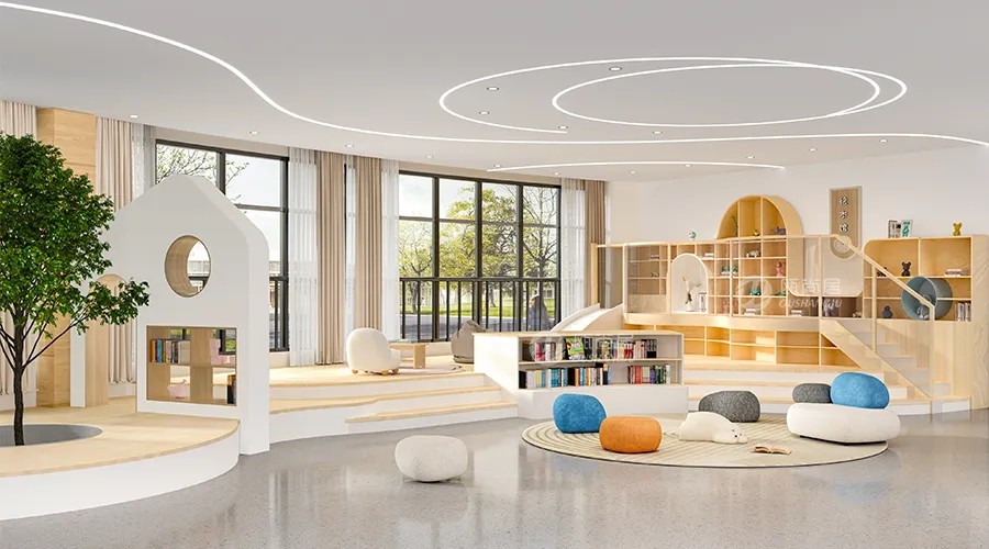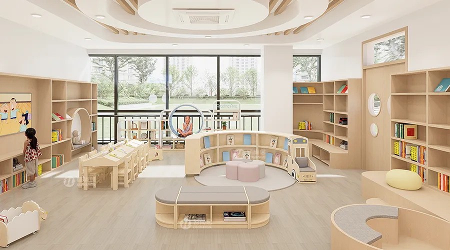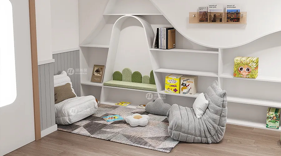 產(chǎn)品亮點:幼兒園閱讀室設(shè)計的核心理念是以孩子為中心,注重培養(yǎng)孩子的閱讀興趣和習(xí)慣。設(shè)置寬敞、舒適的閱讀座位區(qū),如小型沙發(fā)、圓形閱讀桌等,運用溫暖的色彩,如淡黃、卡其色等,營造舒適、寧靜的閱讀氛圍。