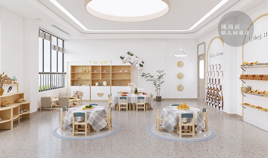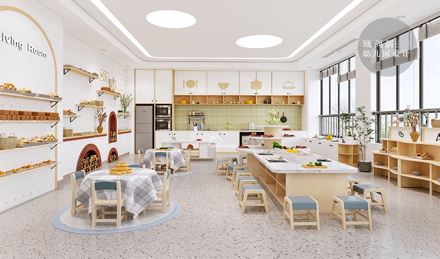 簡約明亮的設計,注重了部分趣味性。通過引入可愛的烘焙元素和色彩明亮的設計,讓生活室變得更加吸引孩子們的注意力,從而激發他們對烘焙的興趣和參與活動的積極性。