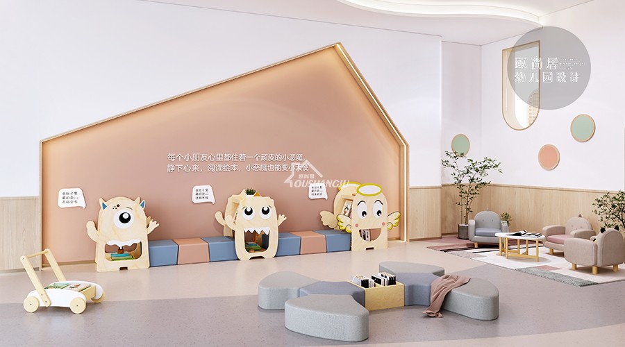 閱讀區的整體配色采用灰粉色,木質與白色。溫馨柔和的配色給孩子滿滿的安全感。卡通造型的書架和桌椅設計,提升了孩子的閱讀興趣讓孩子愛上閱讀。